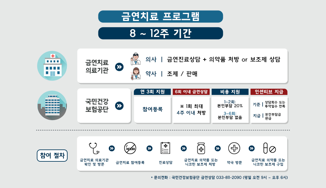 국민건강보험공단은 금연치료 참여 신청한 의료기관과 약국을 통해 금연치료를 희망하는 모든 국민에게 1년에 3번(차수)까지 금연치료를 지원하고 있습니다. 8~12주 프로그램을 통하여 상담과 금연치료 의약품 또는 금연보조제(니코틴 패치, 껌, 정제) 투약(구매) 비용의 일부를 제공하고 있습니다. 또한, 등록자에게는 금연성공가이드북을 제공하여 금연치료 과정에 나타나는 금단증상과 대처 방법 등을 손쉽게 알 수 있도록 안내하고 있습니다. 또한, 금연치료 프로그램 최종 이수 시 인센티브*(1~2회에 본인이 부담한 비용 100% 환급) 제공